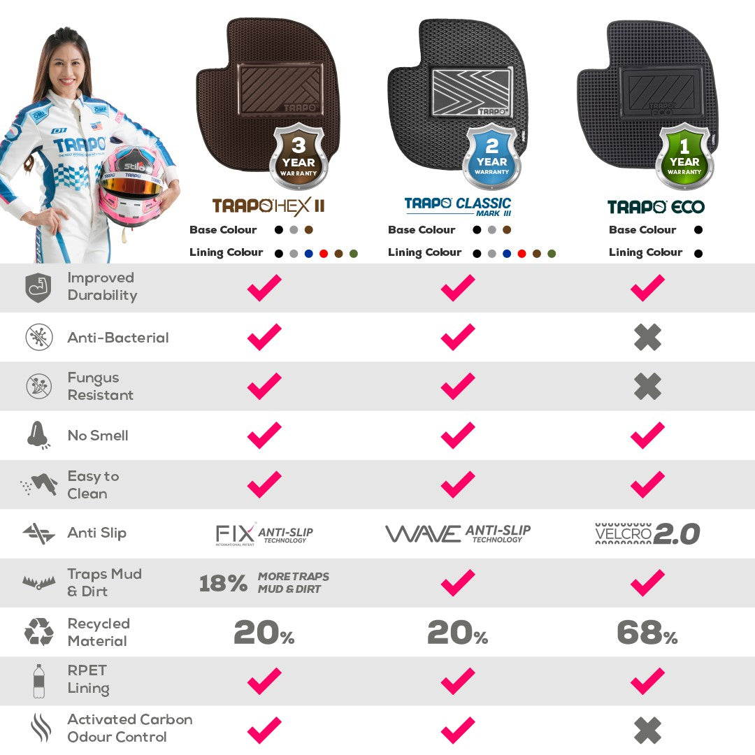Anda berhak mendapatkan yang terbaik, dari Trapo! Karena itu, kami merancang setiap karpet mobil untuk custom best-fit untuk model kendaraan Anda. Tidak ada lagi karpet mobil aneh yang tidak pas. Nikmati pengalaman berkendara yang estetis dan higienis dengan Trapo Hex II.
